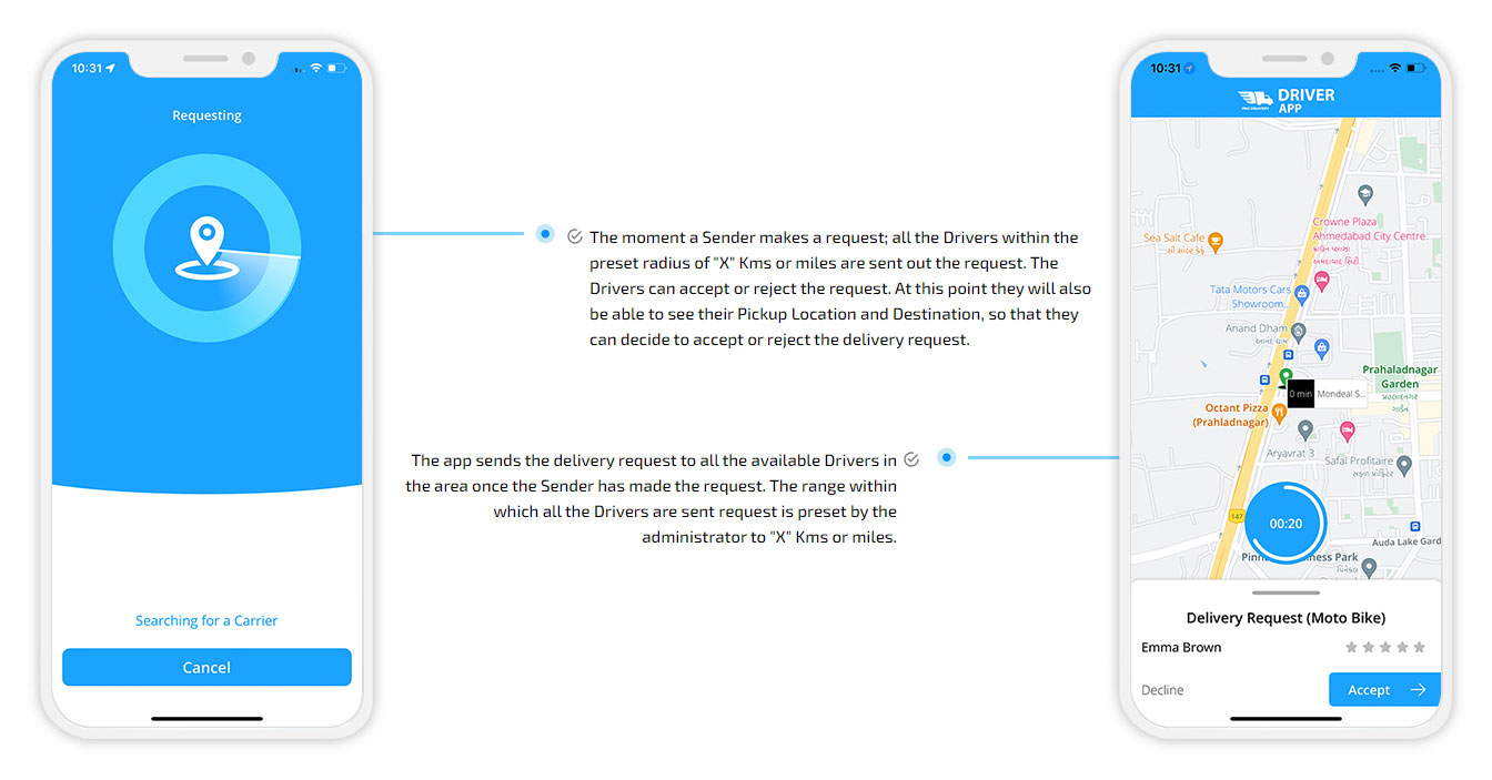Understanding the behavior of the app along with its features and functionality in a step by step flow formatTo truly gauge the true nature of an application, it is imperative to be able to see it in totality. We are so used to using different kinds of apps these days that we assume an app works in a particular format. However, an on demand delivery application is a complex system with many nuances that help it function seamlessly and be navigable at the same time. To ensure that you can understand every detail of the application, our team has put together a step by step flow of the app explaining the behavior and the various screen scenarios of the application’s flow.
