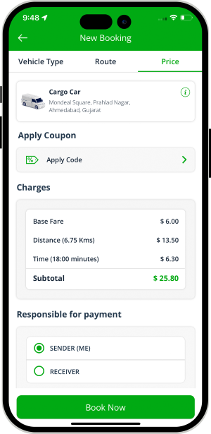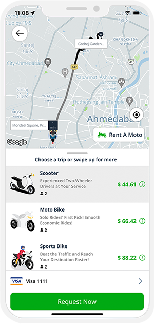 • Moto Booking: In this screen, you can book a Moto Ride. The Rider simply needs to tap on the Moto option, choose the type of Moto they want like Moto Bike, Scooter and Sports bike and then enter their respective pickup as well as drop location. As soon as they perform this step, they shall receive the fare details so as to maintain Ride transparency.