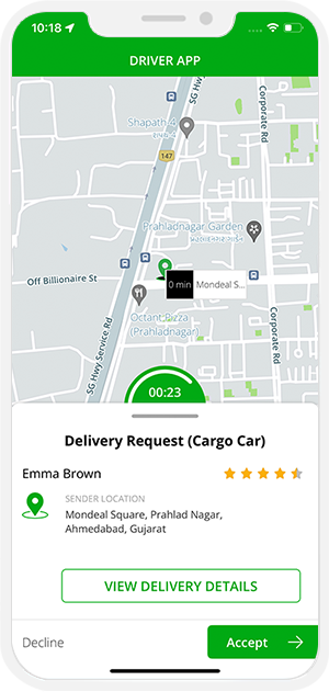 • The Drivers see a screen with all the details and a timer. They must accept or decline the request within the time frame failure of which leads to the request getting automatically declined.