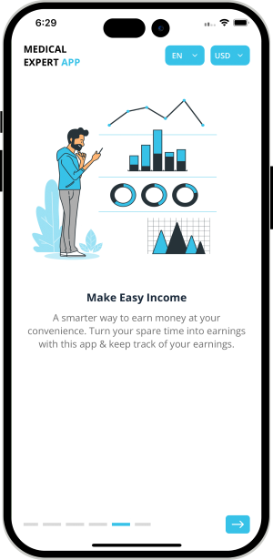 - With this Screen, the Service Medical Expert can choose the Language and Currency of their choice flexibly. They can proceed for login or register through this Screen.