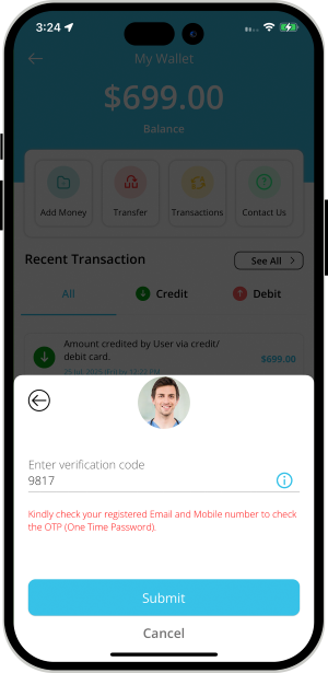 After entering the Phone number, User will be asked to enter the OTP or password (as set by the App owner).