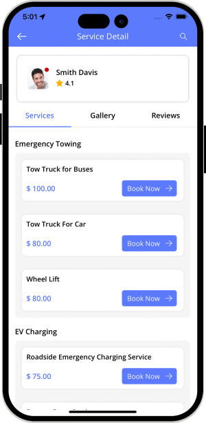 - This feature presents the Users with the best Tow Truck Drivers along with the respective Services they offer and Galleries containing all their work and past reviews they received for the same thus empowering them to select the service/services from the Tow Truck Driver, add special instructions (if any) for the Tow Truck Driver and know the service charges for the same.