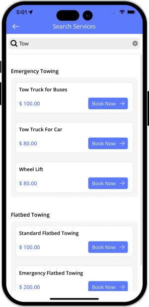 - The user can also book a particular service from the search bar. Services like Emergency Towing, Flatbed Towing, Vehicle Recovery, Flat Tire, Lockout Service, Out of Fuel, etc. Thus, everything on the home page will make it easy for users to use the App, ensuring a fabulous experience.