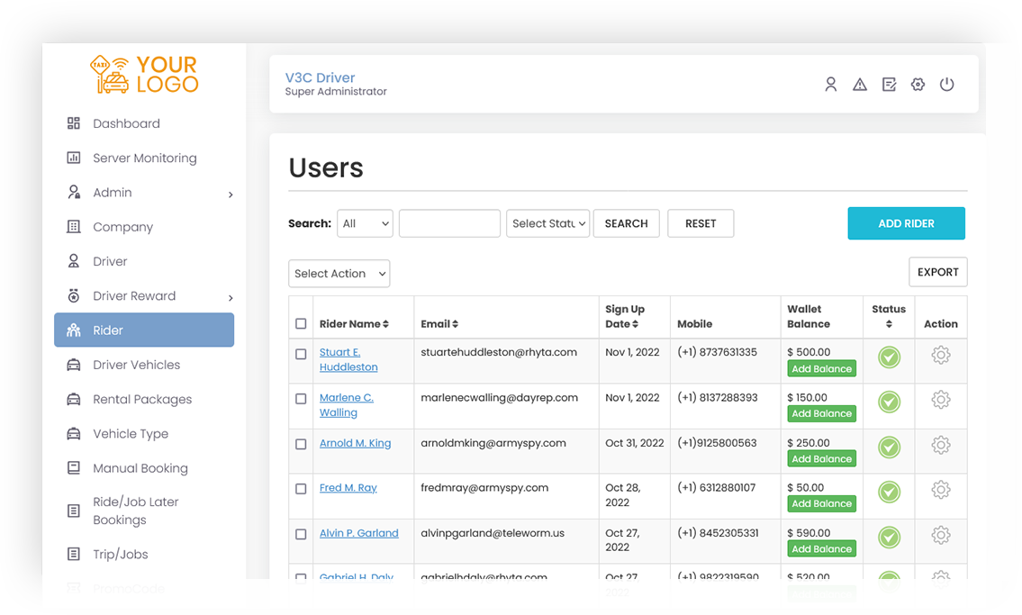 The powerful Uber clone admin panel allows you to Manage all the registered Hotels at the touch of a button. Using the Panel, you can Activate/Deactivate the Hotel Admins, Add/Delete Hotel Admin Profiles, Sort & Filter them, and more.
