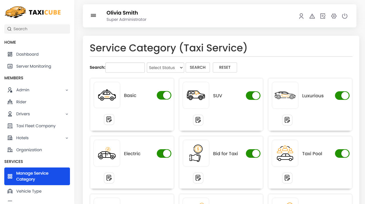 Service CategotyFrom a single dashboard, you, as the app administrator can manage all the taxi services in one go. You can quickly enable and disable the services with easy-to-use toggle controls.
