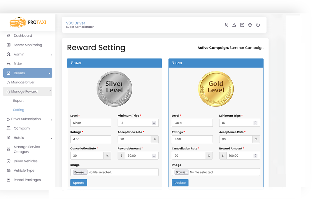 Reward SettingAdmin can define the time duration for reward campaign and also set the criteria to achieve the Level and Rewards for Taxi Drivers.